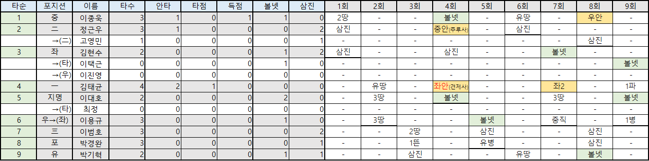 | 타순 | 포지션 | 이름 | 타수 | 안타 | 타점 | 득점 | 볼넷 | 삼진 |