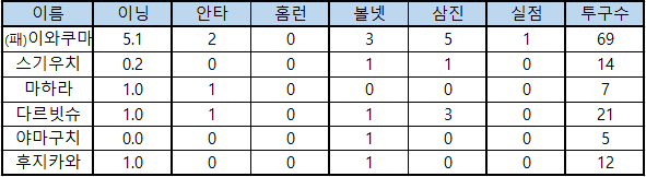 | 이름 | 이닝 | 안타 | 홈런 | 볼넷 | 삼진 | 실점 | 투구수 |