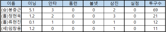 | (홀)정현욱 | 1.2 | 2 | 0 | 0 | 3 | 0 | 21 |