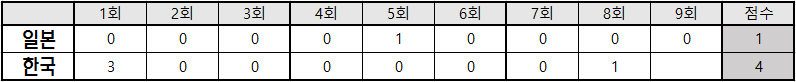 | 7 | 三 | 이범호 | 3 | 0 | 1 | 0 | 1 | 0 |