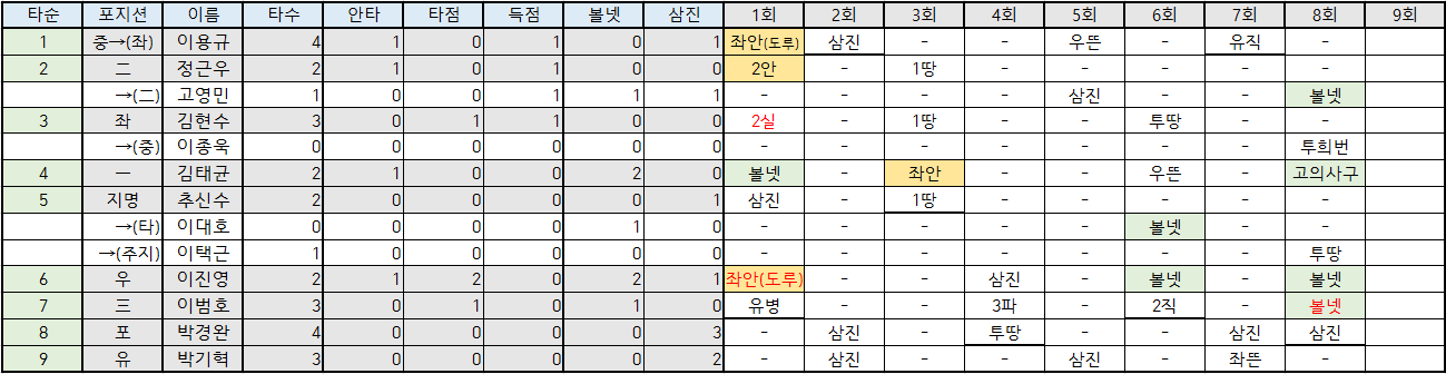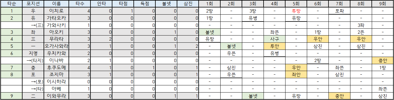 | 타순 | 포지션 | 이름 | 타수 | 안타 | 타점 | 득점 | 볼넷 | 삼진 |