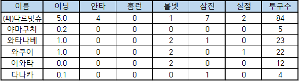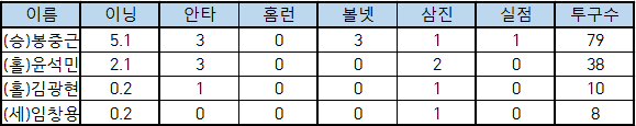 | 이름 | 이닝 | 안타 | 홈런 | 볼넷 | 삼진 | 실점 | 투구수 |