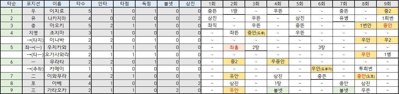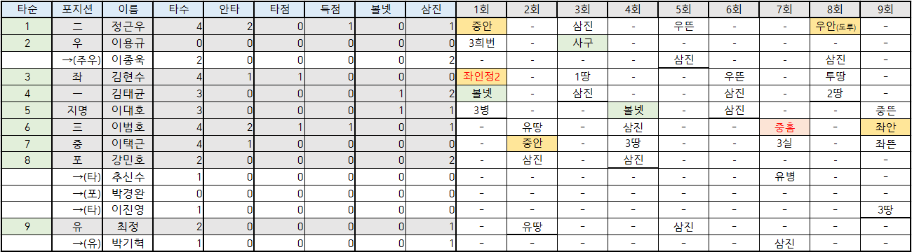| 타순 | 포지션 | 이름 | 타수 | 안타 | 타점 | 득점 | 볼넷 | 삼진 |