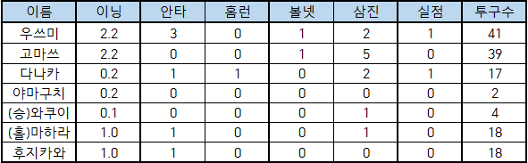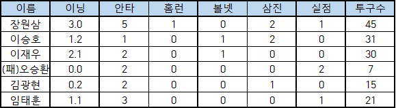 | 이름 | 이닝 | 안타 | 홈런 | 볼넷 | 삼진 | 실점 | 투구수 |