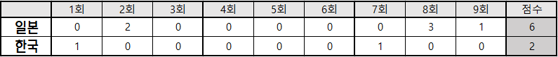 | 2009 WBC 1라운드 1위 결정전 vs일본 기록 (1:0승) (0) | 2022.12.04 |