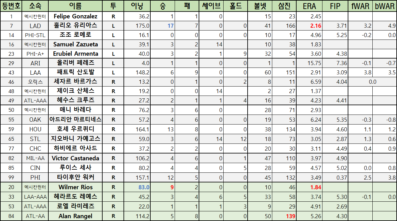 | 33 | LAA-AAA | 헤라르도 레예스 | R | 45.2 | 3 | 4 | 6 | 5 | 33 | 58 | 3.74 | 5.30 | -0.1 | 0.0 |