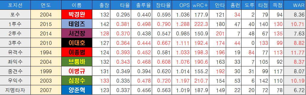 | 포지션 | 연도 | 이름 | 출장 | 타율 | 출루율 | 장타율 | OPS | wRC+ | 안타 | 홈런 | 도루 | 타점 | 득점 | WAR |