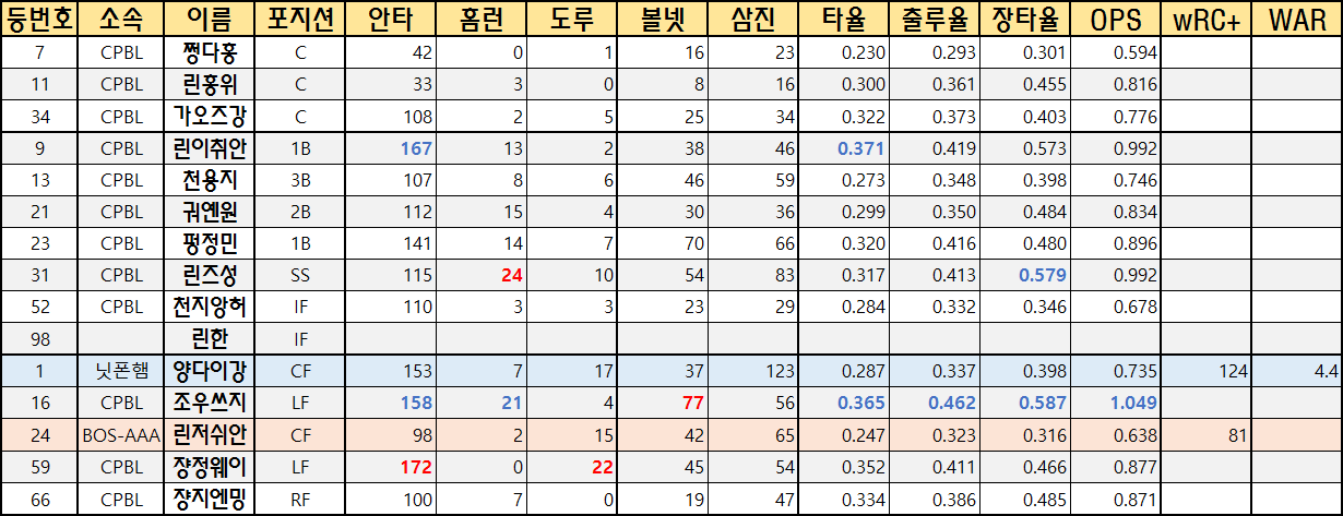 | 31 | CPBL | 린즈성 | SS | 115 | 24 | 10 | 54 | 83 | 0.317 | 0.413 | 0.579 | 0.992 | ||