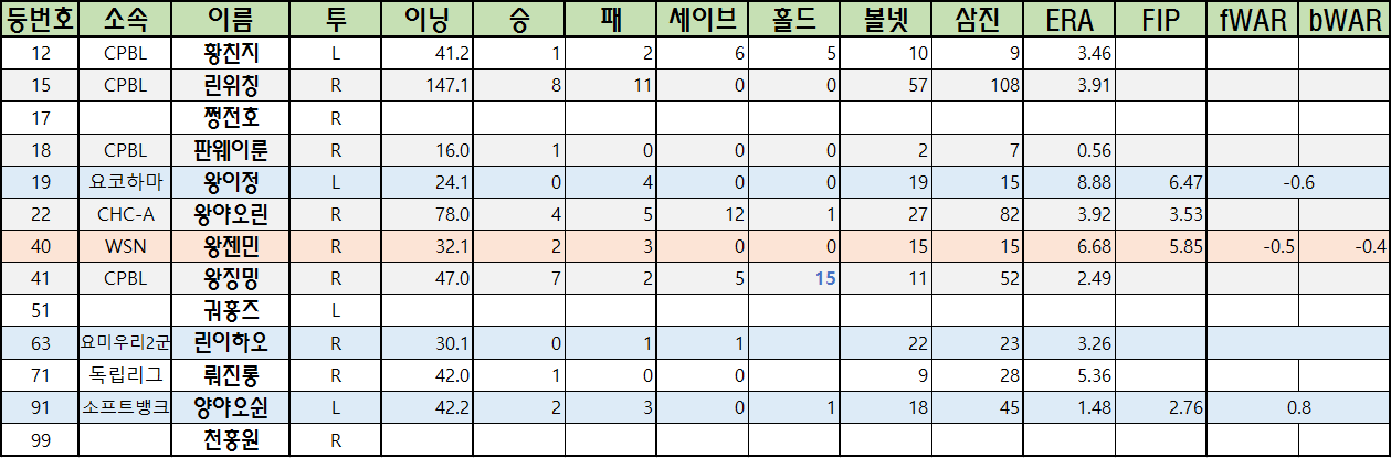 | 40 | WSN | 왕젠민 | R | 32.1 | 2 | 3 | 0 | 0 | 15 | 15 | 6.68 | 5.85 | -0.5 | -0.4 |