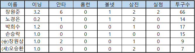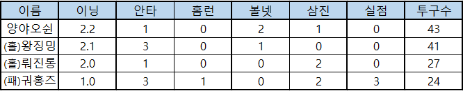 | 이름 | 이닝 | 안타 | 홈런 | 볼넷 | 삼진 | 실점 | 투구수 |