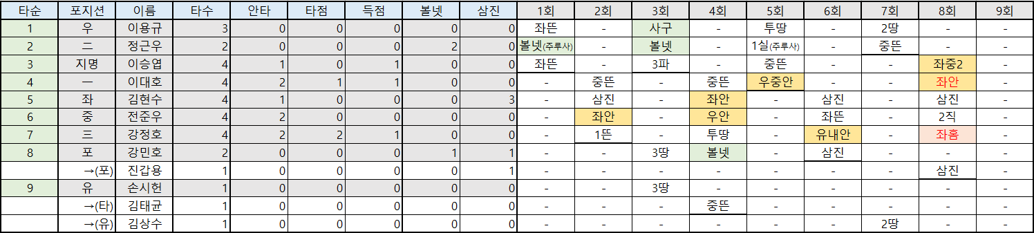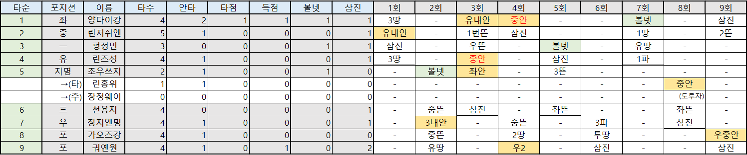 | 타순 | 포지션 | 이름 | 타수 | 안타 | 타점 | 득점 | 볼넷 | 삼진 |