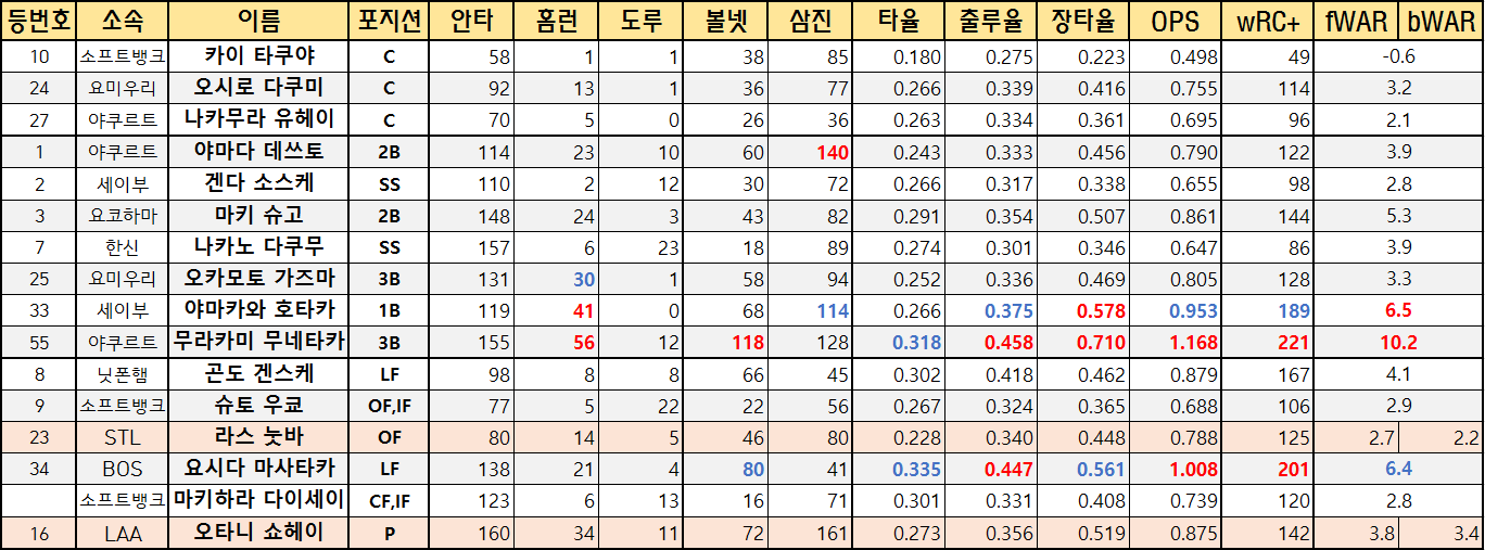 | 33 | 세이부 | 야마카와 호타카 | 1B | 119 | 41 | 0 | 68 | 114 | 0.266 | 0.375 | 0.578 | 0.953 | 189 | 6.5 | |