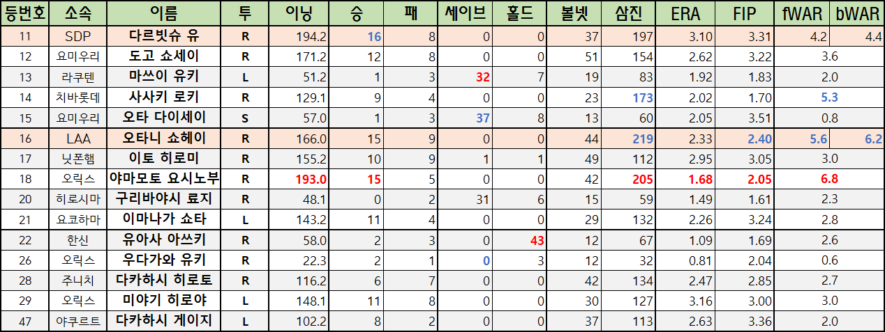 | 16 | LAA | 오타니 쇼헤이 | R | 166.0 | 15 | 9 | 0 | 0 | 44 | 219 | 2.33 | 2.40 | 5.6 | 6.2 |