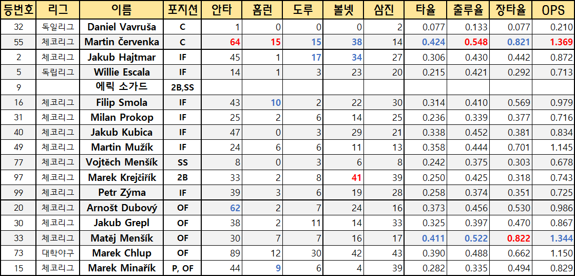 | 30 | 체코리그 | Jakub Grepl | OF | 38 | 2 | 11 | 14 | 33 | 0.325 | 0.397 | 0.470 | 0.867 |