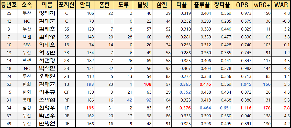 | 등번호 | 소속 | 이름 | 포지션 | 안타 | 홈런 | 도루 | 볼넷 | 삼진 | 타율 | 출루율 | 장타율 | OPS | wRC+ | WAR |