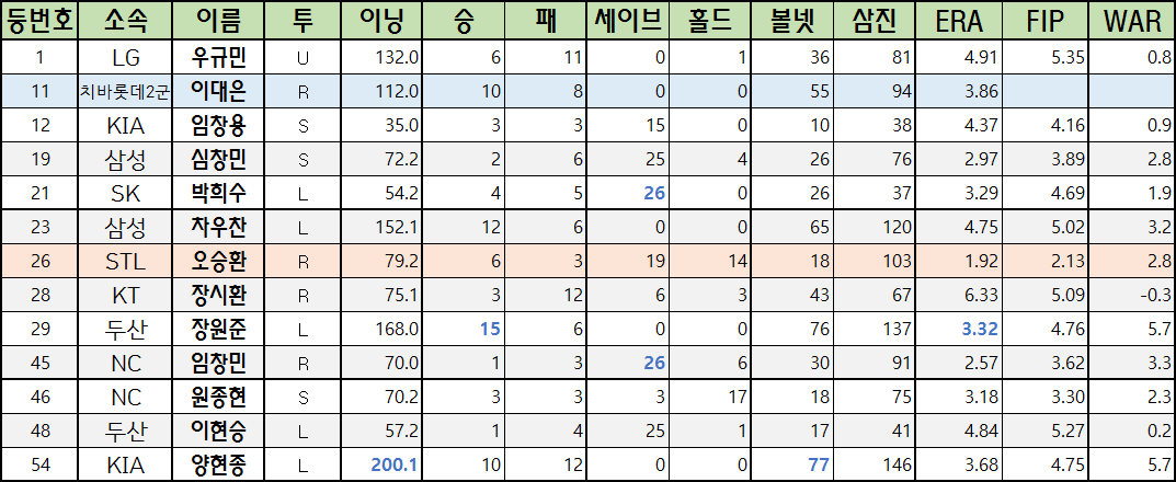 | 등번호 | 소속 | 이름 | 투 | 이닝 | 승 | 패 | 세이브 | 홀드 | 볼넷 | 삼진 | ERA | FIP | WAR |