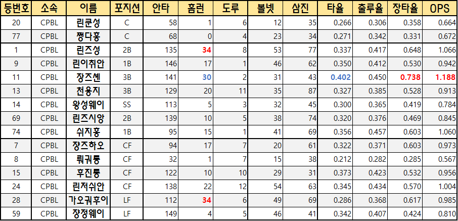 | 11 | CPBL | 장즈셴 | 3B | 141 | 30 | 2 | 31 | 43 | 0.402 | 0.450 | 0.738 | 1.188 |