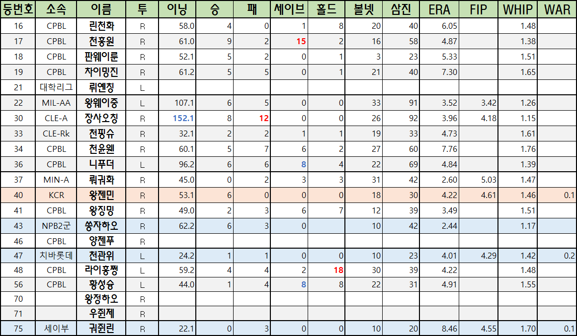 | 18 | CPBL | 판웨이룬 | R | 52.1 | 5 | 2 | 0 | 1 | 3 | 23 | 5.33 | 1.51 | ||