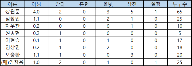 | 이름 | 이닝 | 안타 | 홈런 | 볼넷 | 삼진 | 실점 | 투구수 |