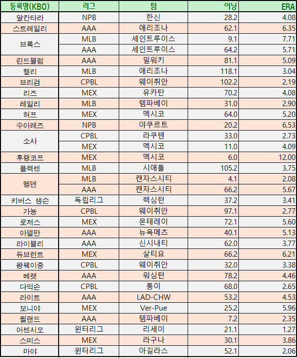 | 등록명(KBO) | 리그 | 팀 | 이닝 | ERA |