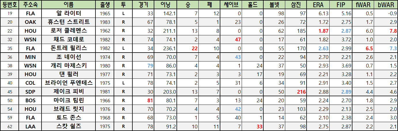 | 54 | HOU | 브래드 릿지 | 1976 | R | 70 | 70.2 | 4 | 4 | 42 | 0 | 23 | 103 | 2.29 | 2.13 | 2.5 | 2.0 |