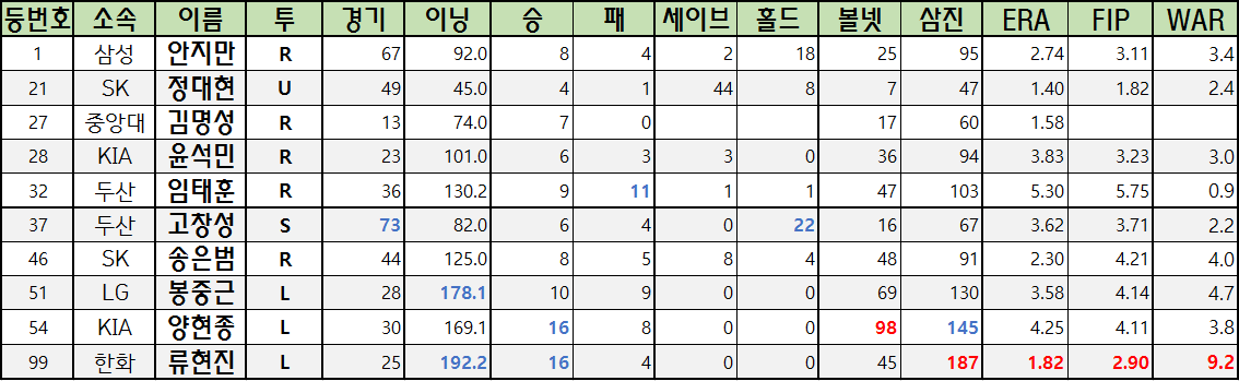 | 등번호 | 소속 | 이름 | 투 | 경기 | 이닝 | 승 | 패 | 세이브 | 홀드 | 볼넷 | 삼진 | ERA | FIP | WAR |