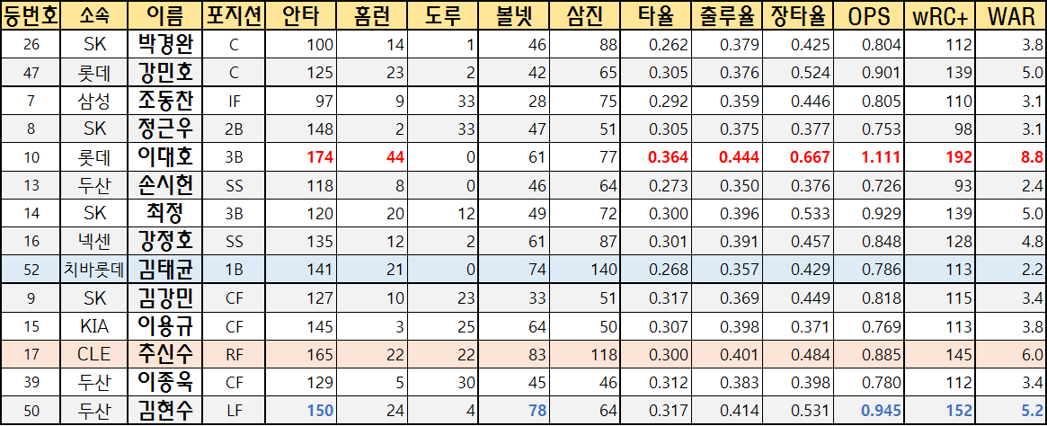 | 등번호 | 소속 | 이름 | 포지션 | 안타 | 홈런 | 도루 | 볼넷 | 삼진 | 타율 | 출루율 | 장타율 | OPS | wRC+ | WAR |