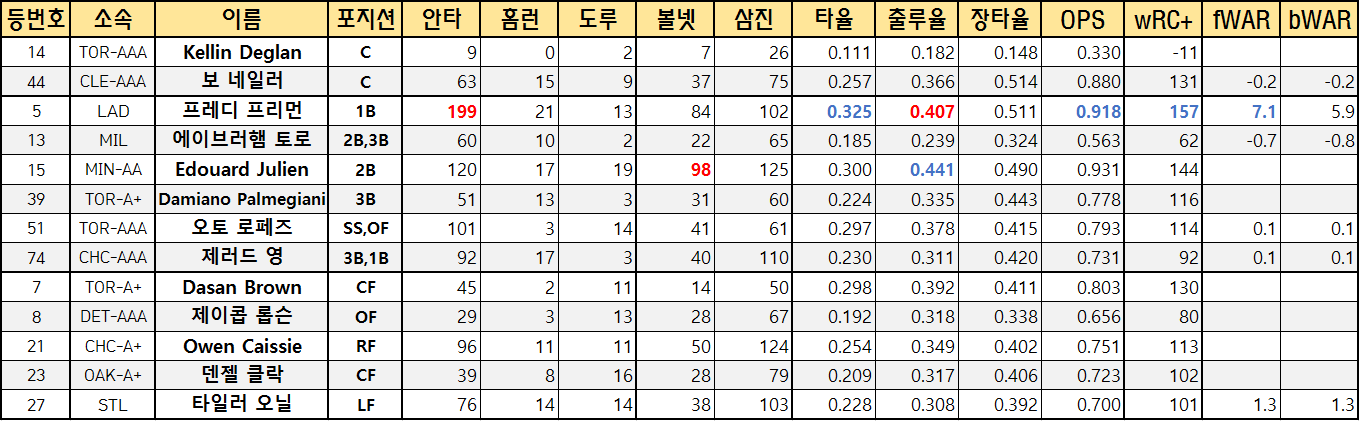 | 51 | TOR-AAA | 오토 로페즈 | SS,OF | 101 | 3 | 14 | 41 | 61 | 0.297 | 0.378 | 0.415 | 0.793 | 114 | 0.1 | 0.1 |