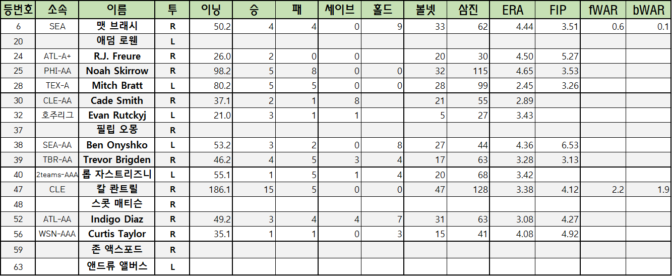 | 6 | SEA | 맷 브래시 | R | 50.2 | 4 | 4 | 0 | 9 | 33 | 62 | 4.44 | 3.51 | 0.6 | 0.1 |