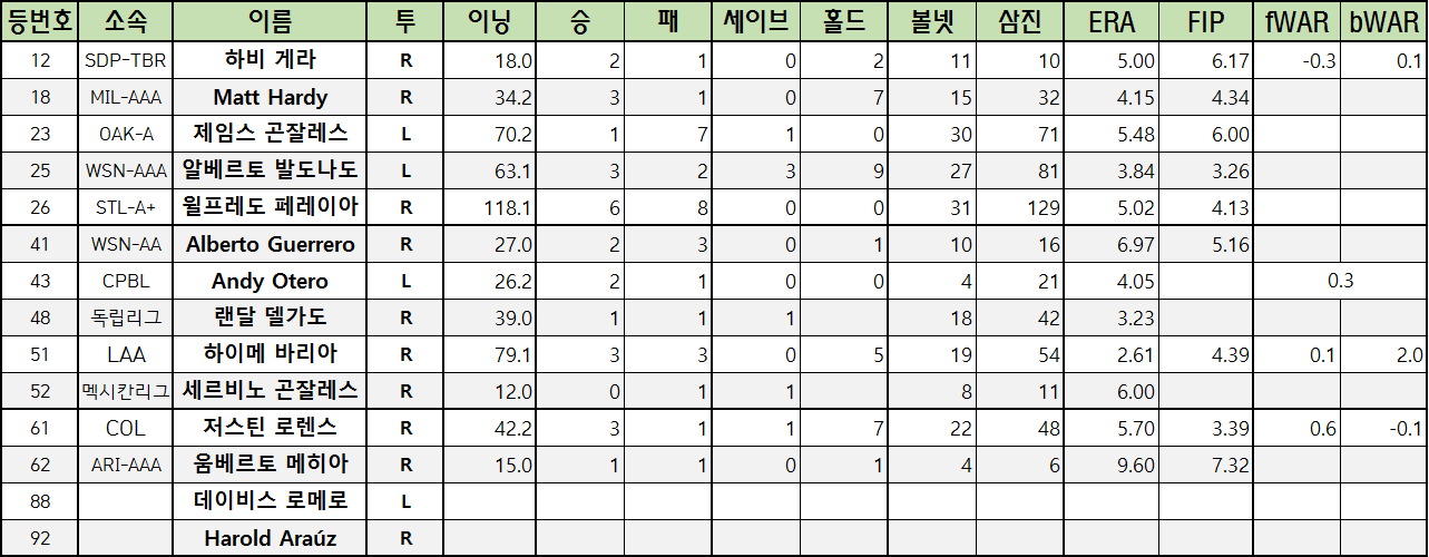 | 26 | STL-A+ | 윌프레도 페레이아 | R | 118.1 | 6 | 8 | 0 | 0 | 31 | 129 | 5.02 | 4.13 | ||
