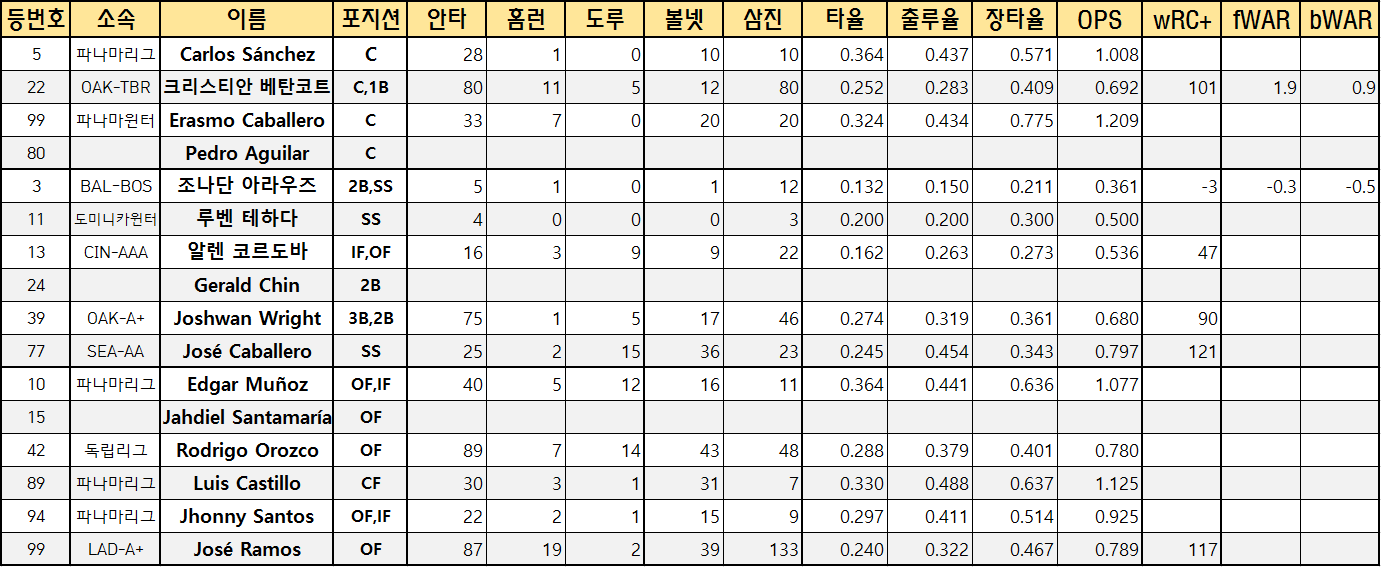 | 89 | 파나마리그 | Luis Castillo | CF | 30 | 3 | 1 | 31 | 7 | 0.330 | 0.488 | 0.637 | 1.125 | |||