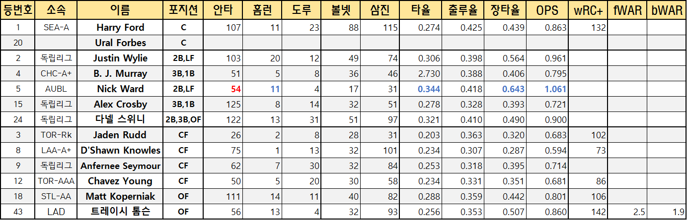 | 24 | 독립리그 | 다넬 스위니 | 2B,3B,OF | 122 | 13 | 31 | 51 | 97 | 0.321 | 0.410 | 0.490 | 0.900 | |||
