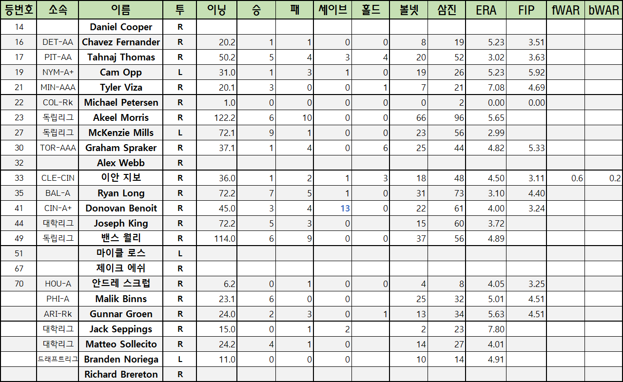 | 44 | 대학리그 | Joseph King | R | 72.2 | 5 | 3 | 0 | 15 | 60 | 3.72 | ||||