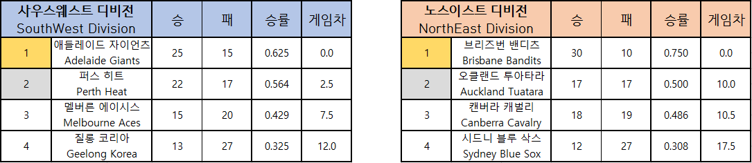 호주리그는 8개의 팀을 2개의 디비전 (노스이스트, 사우스웨스트) 으로 나누어 40경기를 치룹니다.