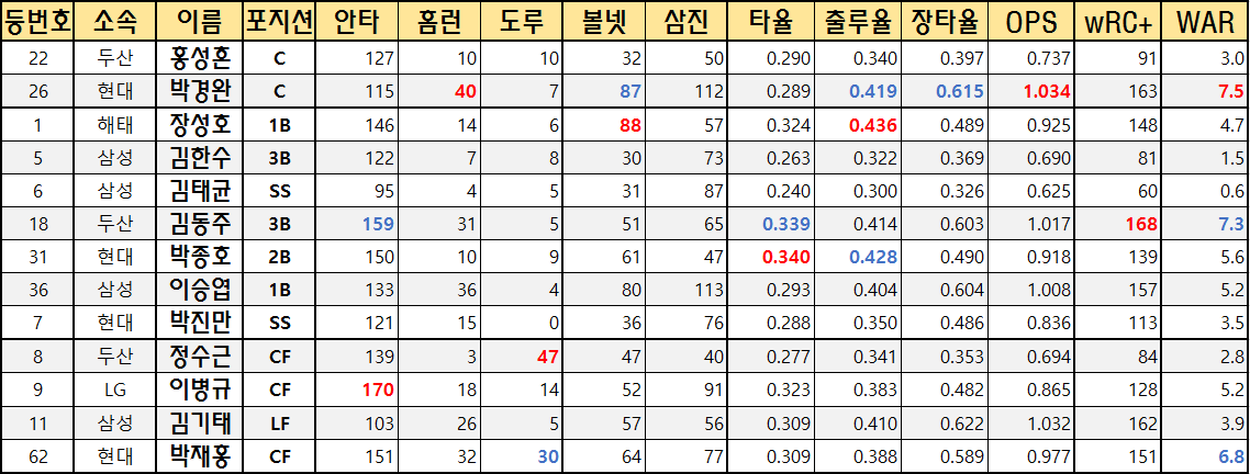 | 등번호 | 소속 | 이름 | 포지션 | 안타 | 홈런 | 도루 | 볼넷 | 삼진 | 타율 | 출루율 | 장타율 | OPS | wRC+ | WAR |