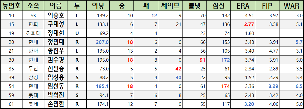 | 등번호 | 소속 | 이름 | 투 | 이닝 | 승 | 패 | 세이브 | 볼넷 | 삼진 | ERA | FIP | WAR |
