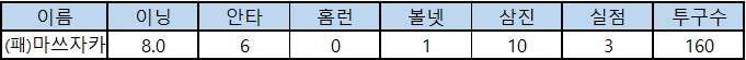 일본 선발투수 마쓰자카 다이스케는 160구 3실점 0자책 으로 완투패했습니다.