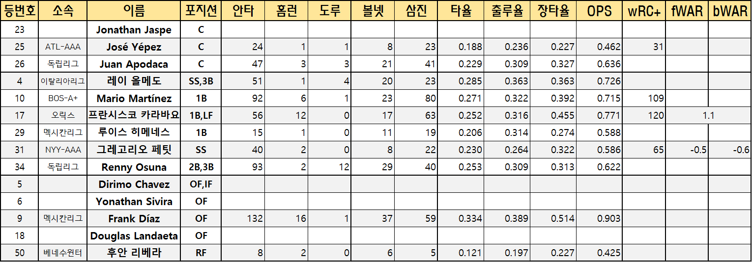 | 34 | 독립리그 | Renny Osuna | 2B,3B | 93 | 2 | 12 | 29 | 40 | 0.253 | 0.309 | 0.313 | 0.622 | |||