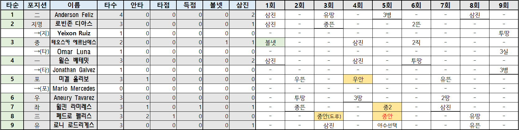 | 타순 | 포지션 | 이름 | 타수 | 안타 | 타점 | 득점 | 볼넷 | 삼진 |