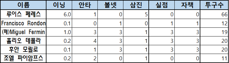 | 이름 | 이닝 | 안타 | 볼넷 | 삼진 | 실점 | 자책 | 투구수 |