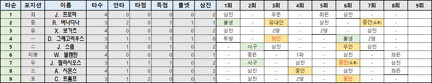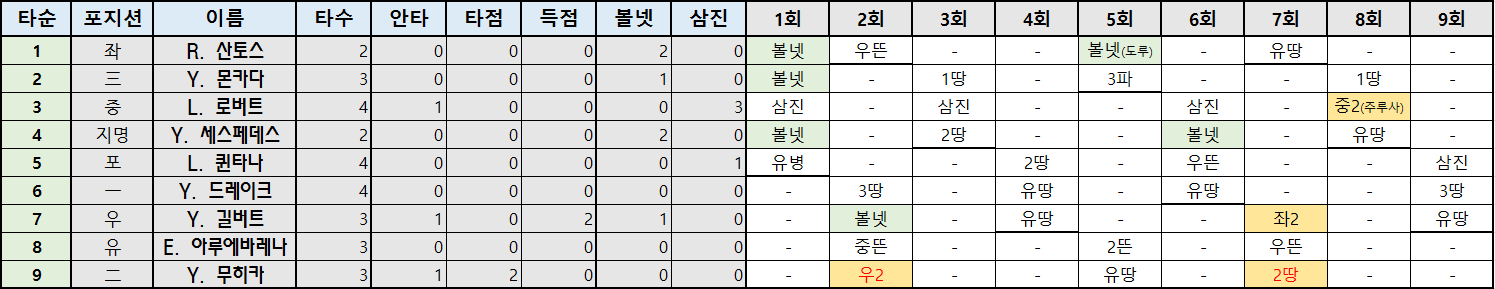 | 타순 | 포지션 | 이름 | 타수 | 안타 | 타점 | 득점 | 볼넷 | 삼진 |