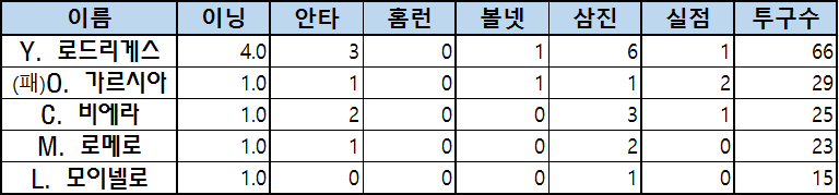| 이름 | 이닝 | 안타 | 홈런 | 볼넷 | 삼진 | 실점 | 투구수 |