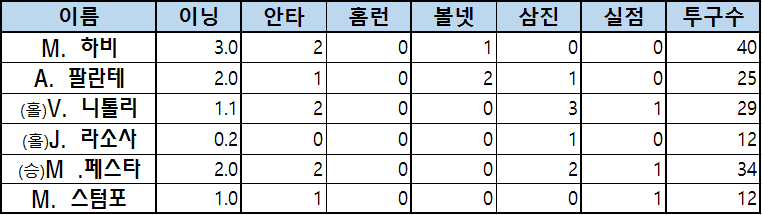 | 이름 | 이닝 | 안타 | 홈런 | 볼넷 | 삼진 | 실점 | 투구수 |