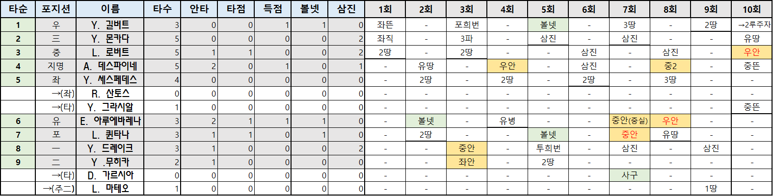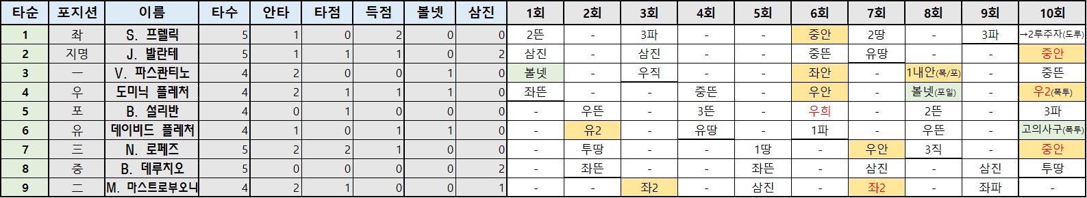| 타순 | 포지션 | 이름 | 타수 | 안타 | 타점 | 득점 | 볼넷 | 삼진 |
