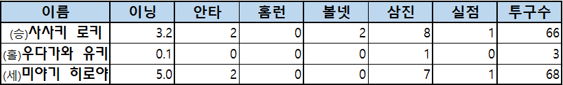 | (승)사사키 로키 | 3.2 | 2 | 0 | 2 | 8 | 1 | 66 |