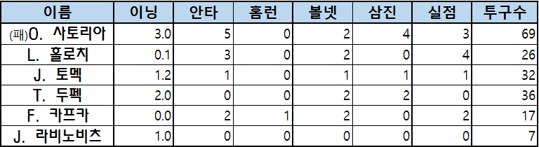 | 이름 | 이닝 | 안타 | 홈런 | 볼넷 | 삼진 | 실점 | 투구수 |