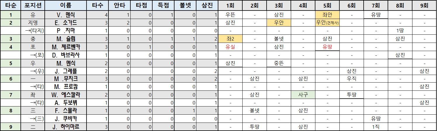 | 타순 | 포지션 | 이름 | 타수 | 안타 | 타점 | 득점 | 볼넷 | 삼진 |