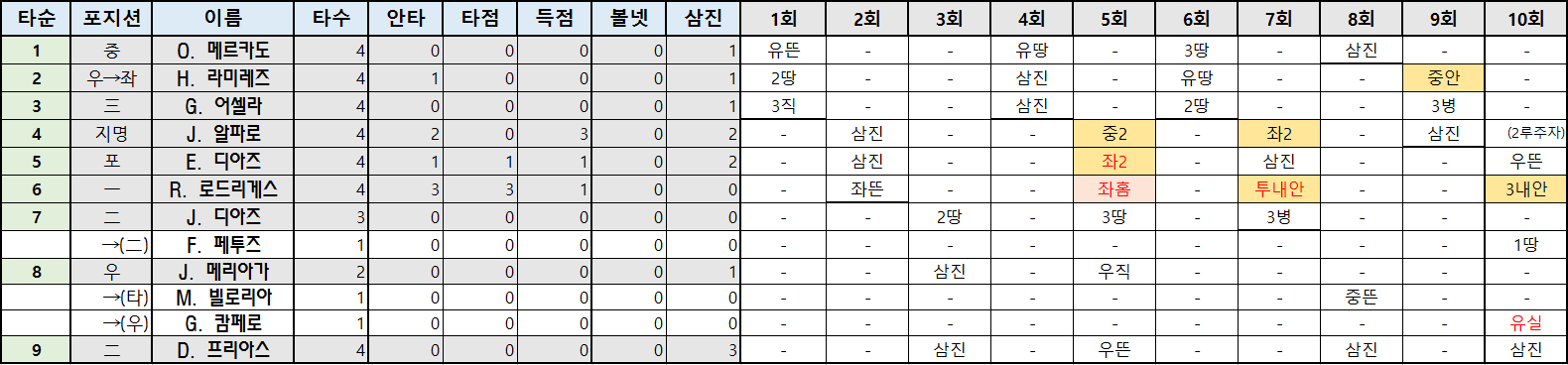 | 7 | 二 | J. 디아즈 | 3 | 0 | 0 | 0 | 0 | 0 |