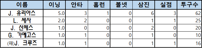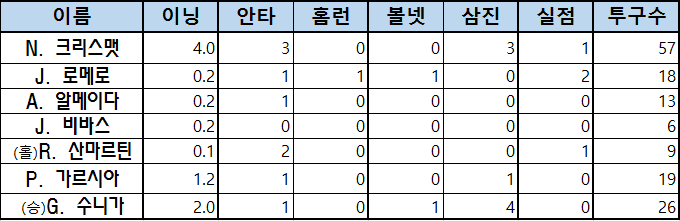 | 이름 | 이닝 | 안타 | 홈런 | 볼넷 | 삼진 | 실점 | 투구수 |