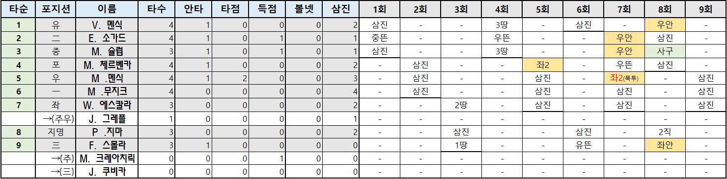 7 | 좌 | W. 에스칼라 | 3 | 0 | 0 | 0 | 0 | 2 |